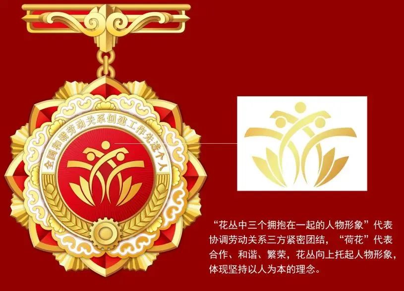 奖章中心图形为“花丛中三个人物形象紧紧拥抱在一起”,代表在党的领导下,政府、工会、企业三方共同参与劳动关系协商协调,不断凝聚和谐共识,形成强大合力,让“企业关心关爱职工、职工爱岗爱企”的和谐理念如同花朵一般绽放,打造企业与职工的利益共同体、事业共同体、命运共同体,构建中国特色和谐劳动关系,奋进新征程,共筑中国梦。