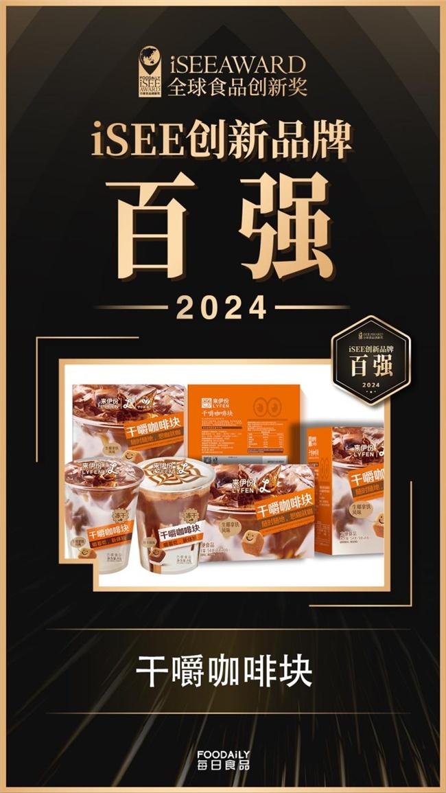 作为食品饮料行业备受认可的权威领先奖项,iSEE全球食品创新奖自2018年发起以来,始终以“彰显食品创新精神,让好的产品被更多人看见”为使命,倡导“全球标准+第三方专业评审+非商业化”的评奖标准,以发现、表彰和传播全球“创新”与“美味”标杆,真实反映品牌的食品创新力、用户体验感、消费者价值、消费洞察力、科技领导力和商业表现力,含金量十足。来伊份旗下两款产品“冻干咖啡块”“宝儿蛋”能够通过层层筛选,荣登iSEE创新品牌百强榜,不仅是业内外对这两款产品的认可与喜爱,更彰显了来伊份在产品研发创新方面的突出表现,意味着其产品和品牌影响力得到了业内外的一致认可,也预示着消费市场对于高品质创新产品的需求越来越旺盛。