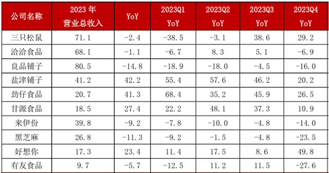 2023年10家零食行业样本上市公司营收情况(亿元,%)