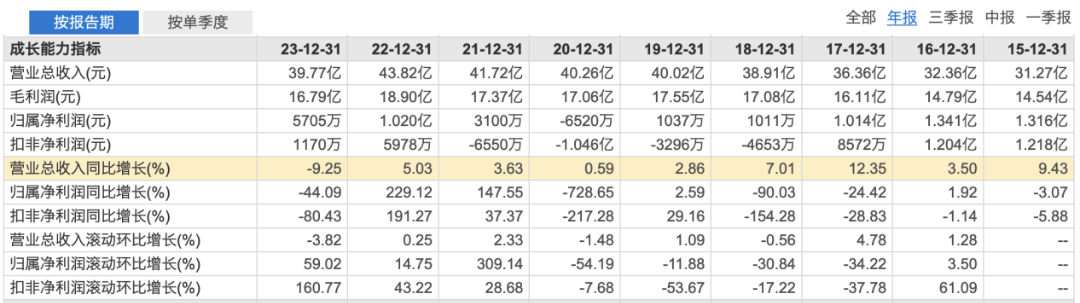 财报显示,来伊份在2023年实现营业收入39.77亿元,上年同期为43.82亿元,同比下降9.246%。归属于上市公司股东的净利润为5705万元,上年同期为1.02亿元,同比下降44.09%。
