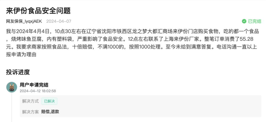 来伊份公司在4月7日跟进了这起投诉,最终4月12日,发起投诉的网友申请完结,解决方案是企业赔偿、退款。