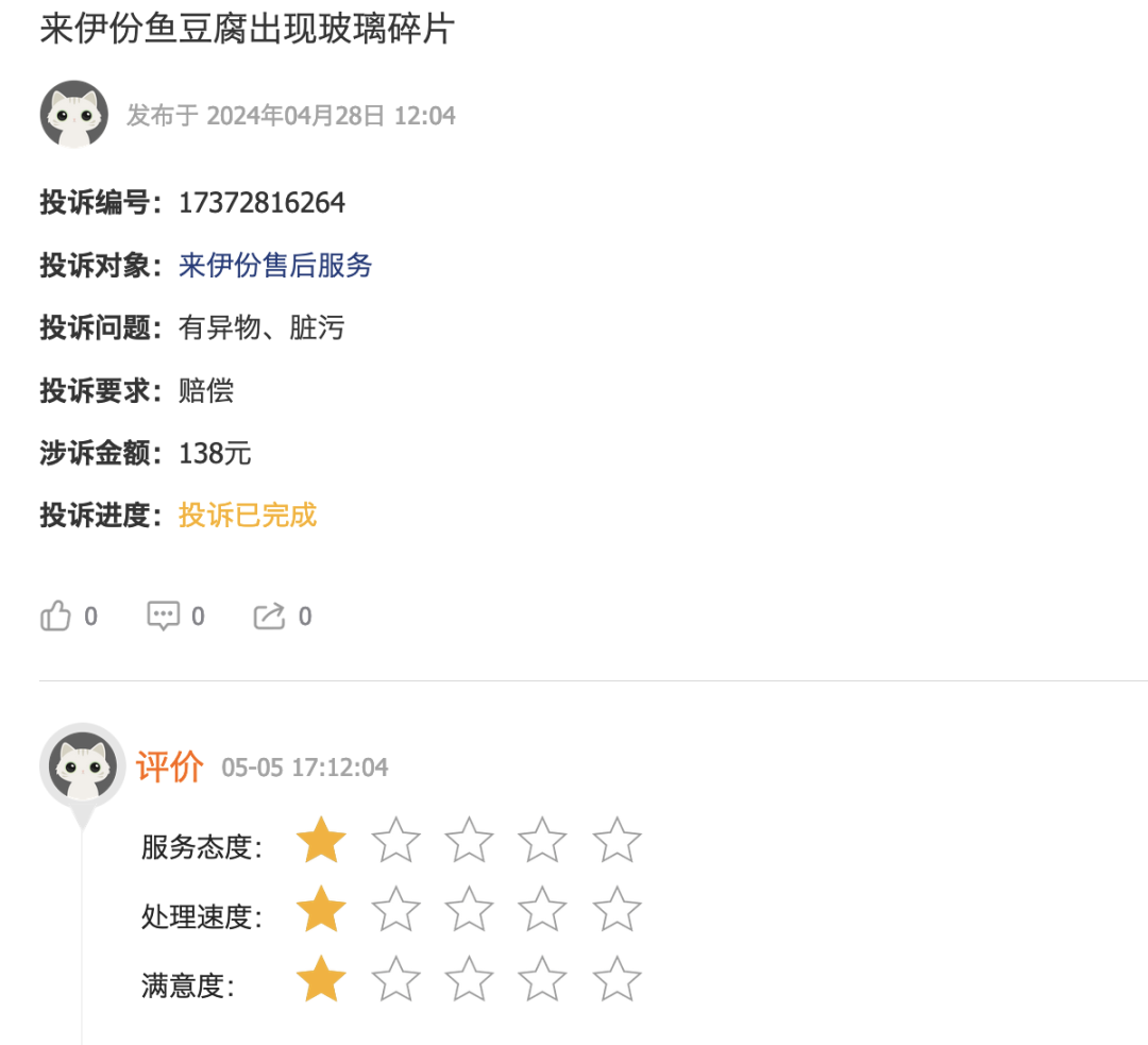 来伊份的官方账号在4月28日和5月4日两度回复该起投诉,最终用户在5月5日确认投诉完成,但他给这起投诉的处理结果评价为1颗星(满分5颗星)。