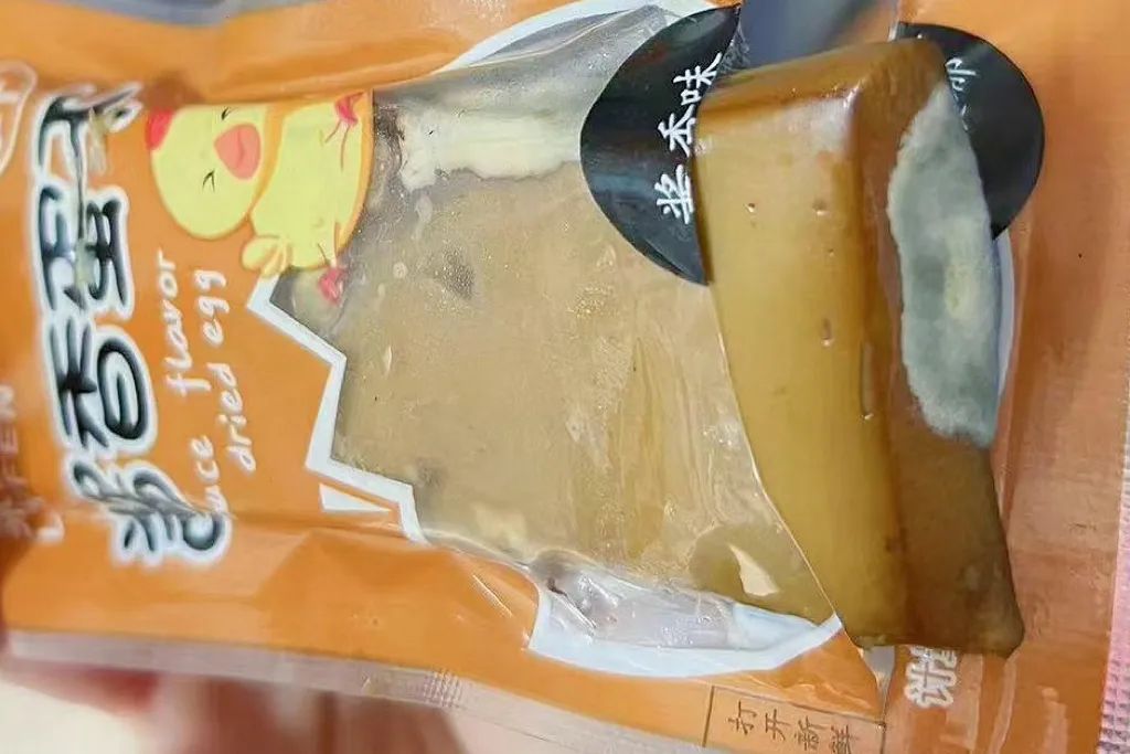 来自江苏苏州的陈女士向记者表示,此前,她在苏州的一家来伊份线下门店购买的零食遭遇了“发霉、胀袋”的食品质量问题。“在门店消费后的第二天,我就发现‘酱香蛋干’发霉长毛了,小蛋糕也胀袋了,‘酱香蛋干’ 发霉的部分是在产品包装的背面,所以从外包装看不出来有问题。”