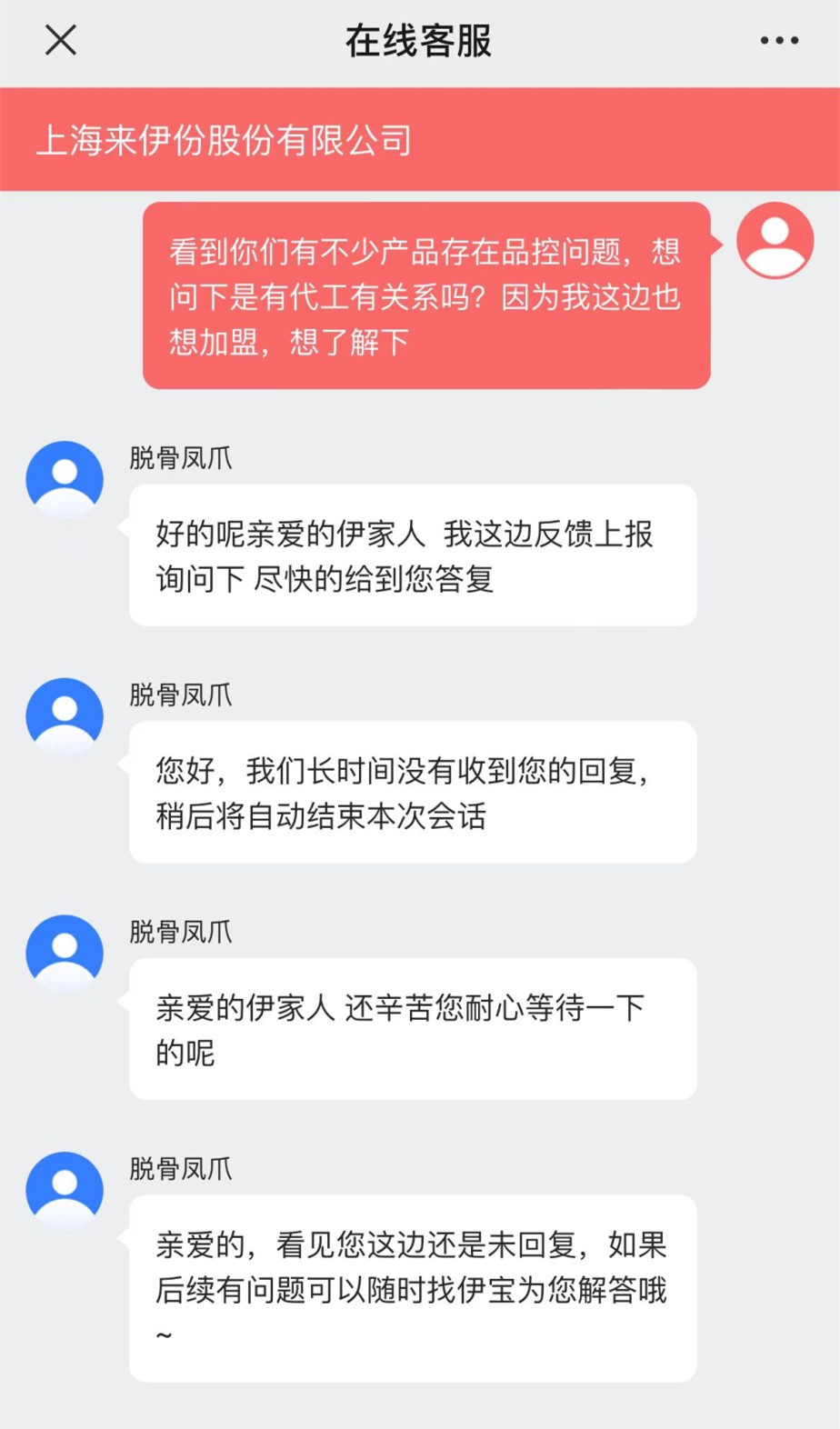 6月19日,记者就食品质量问题拨打了来伊份客服电话,按语音提示选择“投诉”时却未拨通。此外,记者在来伊份公众号尝试咨询客服食品质量问题,客服回复会安排专员联系,截至发稿时,记者未收到回复。