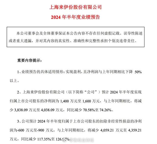 运营焦虑一直延续至今,7月10日,来伊份发布的2024 年半年度业绩预告数据显示,公司归母净利润预计为1400-1600万元,同比下降70.58%-74.26%;扣非净利润预计由盈转亏,亏损金额约600-900万元,而上年同期为盈利3459.21万元。