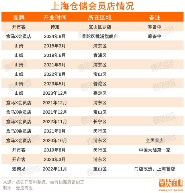 第四,来伊份仓储会员店的“出生点”,选在了仓储会员店竞争最激烈的上海。据壹览商业不完全统计,截至2024年6月,上海至少有13家仓储会员超市在营,2家仓储会员超市正在筹建,1家仓储会员超市正在改造。这意味着,上海至少有16家仓储会员超市。