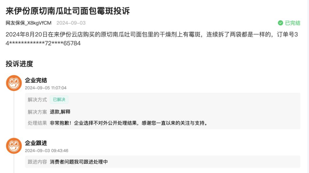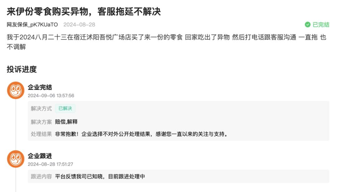 当天,来伊份跟进处理了这起投诉,并在9月5日完结了这起投诉,解决方案是退款、解释。处理结果企业选择不对外公开。