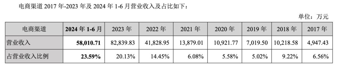 2024年上半年,盐津铺子的电商渠道营收为5.8亿元,营收占比为23.59%,占比创下历史新高。