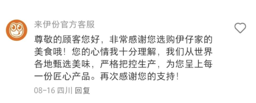 8月16日,来伊份官方客服账号在安慰其中一位消费者时留言称:“您的心情我十分理解,我们从各地甄选美味,严格把控生产,为您呈上每一分匠心产品。”