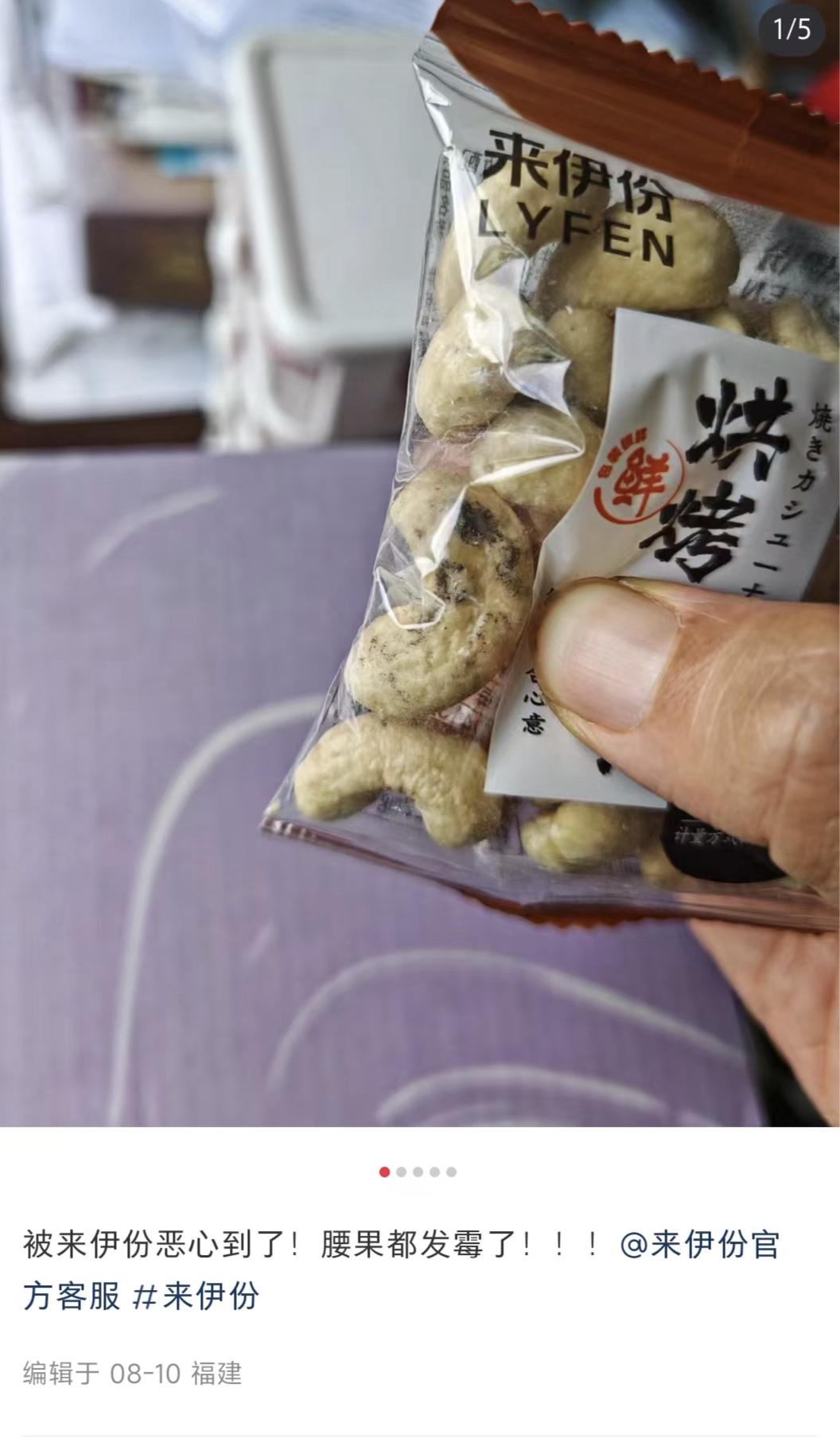 其次是“腰果发霉”事件:除了杨梅事件外,还有一位消费者在小红书爆料来伊份的腰果出现了发霉的情况。