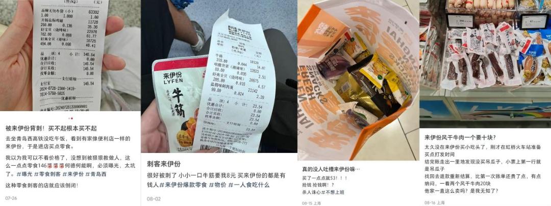 8月2日,有一位消费者因为一份牛筋卖8元而将来伊份称作“刺客”。8月15日和8月16日,有两位消费者在社交平台吐槽来伊份的产品价格贵,其中一人抱怨“来伊份风干牛肉一个要十块”。