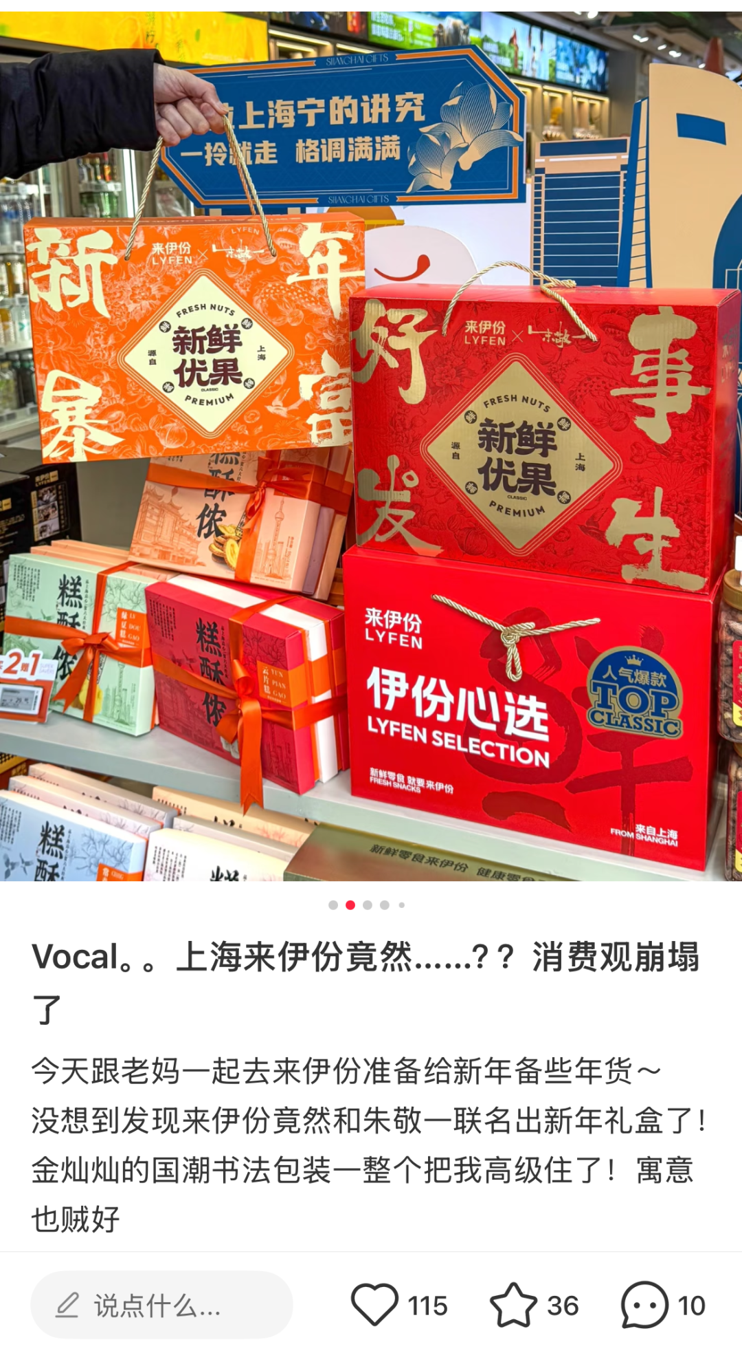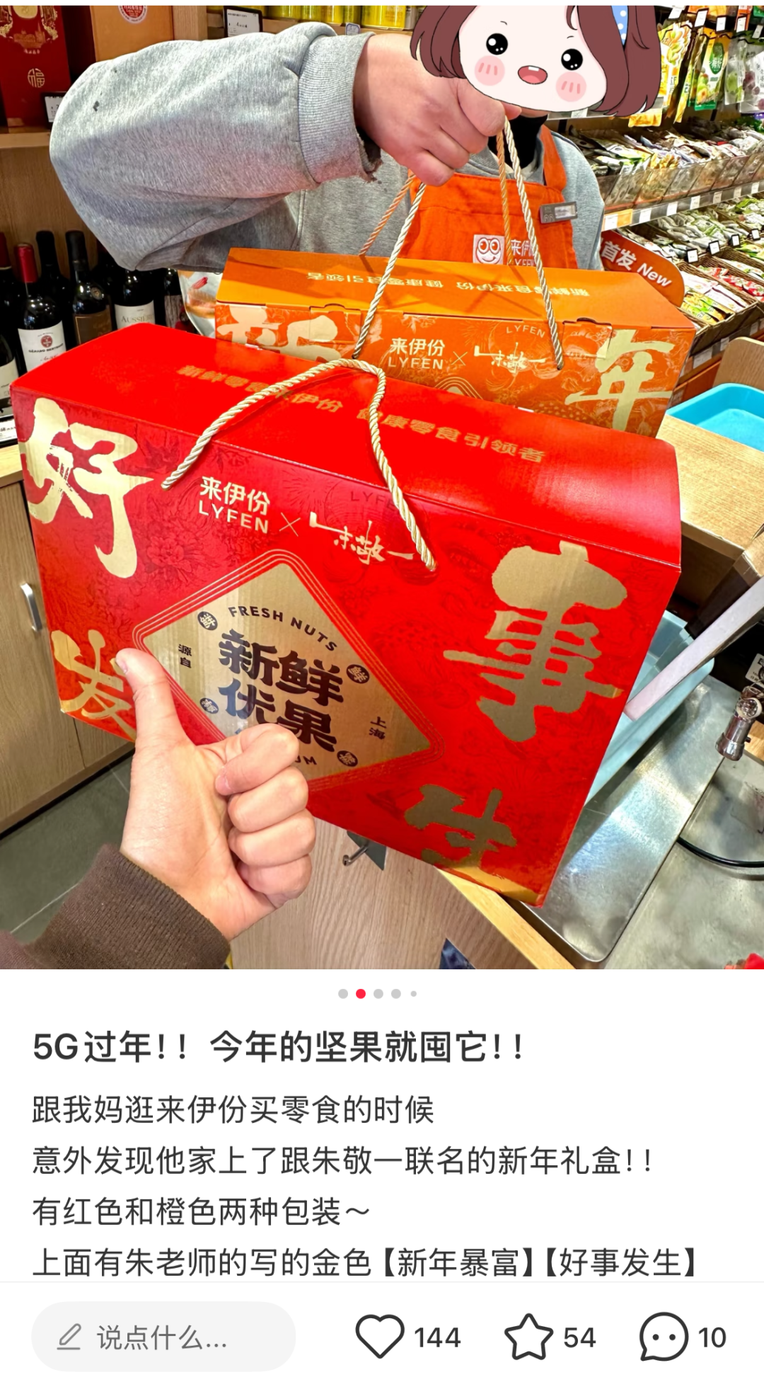 此外,该联名礼盒的推出也反映了当下消费市场中传统文化与现代商业的深度融合趋势。礼盒上的书法元素以及蕴含的美好祝福,不仅是对传统文化的传承,也是在现代商业语境下的创新表达。通过将书法艺术与现代零食礼盒相结合,来伊份与朱敬一让传统文化在新的载体上焕发出新的生机与活力,使更多的年轻人在消费过程中接触和了解传统文化,促进了传统文化的传承和发展。