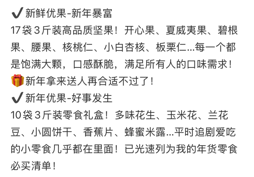 主打坚果品类,“新鲜优果”汇聚了如核桃仁、腰果、开心果、巴旦木、碧根果、夏威夷果等多款热门坚果零食,寓意着新的一年“硕果累累”。秉持着对高品质的严格把控,这些精心挑选的零食组合,从原料的采购到生产加工的每一个环节,都遵循着最高标准,确保消费者能够品尝到安全、健康、美味的零食。既考虑了不同年龄段人群的口味偏好,又兼顾了营养均衡,让消费者都能在其中找到自己喜爱的味道,为欢乐的春节时光增添更多美味记忆。同时,来伊份还注重产品的创新与研发,不断推陈出新,为传统的春节零食赋予了新的活力和口感,让中国人的年味在传承中不断升级。