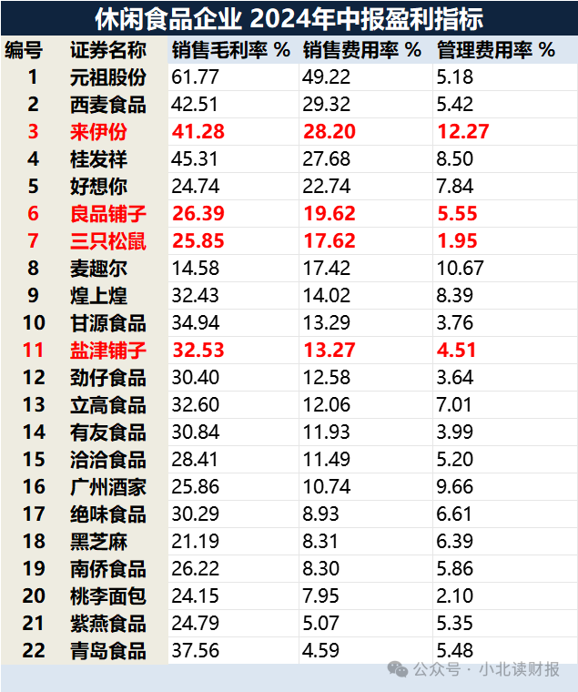 特别是管理费用率,来伊份的该比率达到了12.27%,这在同行中是遥遥领先的存在,良品铺子为5.55%,盐津铺子为4.51%,三只松鼠更低,仅为1.95%。