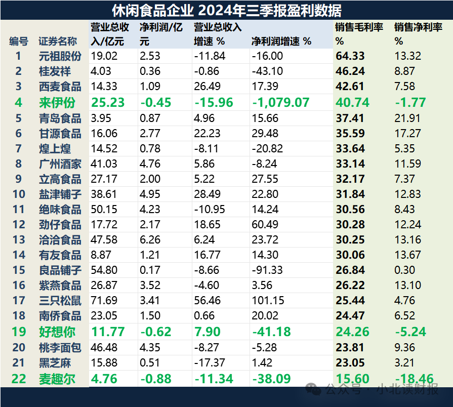 中休闲食品行业共统计了22家上市企业,去年前三季度亏损的企业不多,除了来伊份、好想你和麦趣尔。