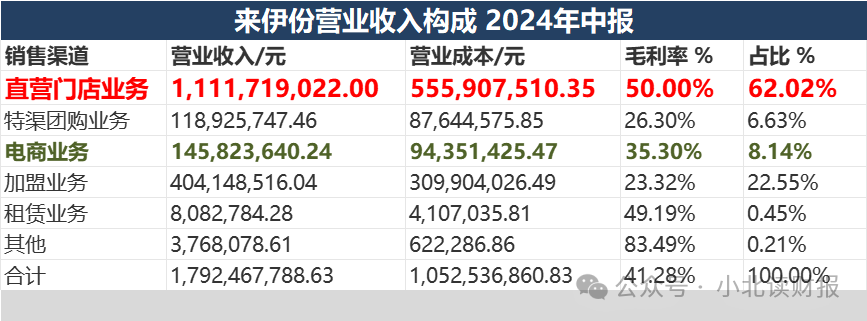 来伊份的销售收入以线下收入为主,且以直营门店业务为主,2024年上半年,来伊份62%的收入来自于线下直营门店。