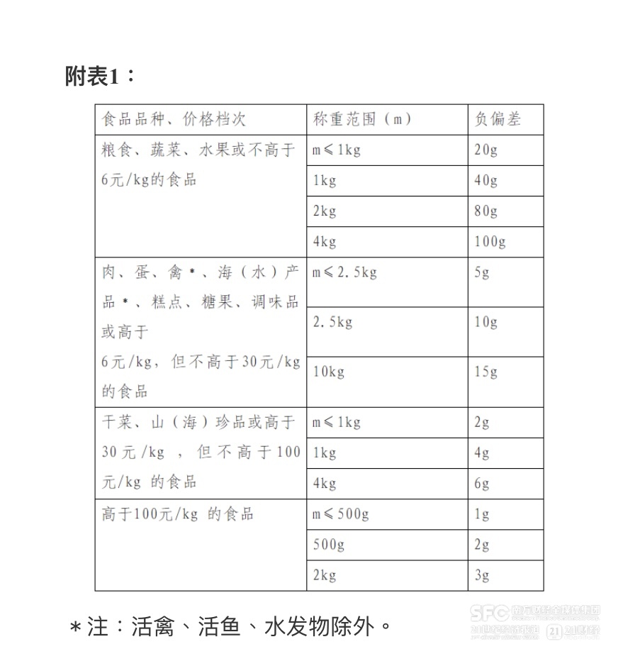 《零售商品称重计量监督管理办法》附表1,规定了不同食品种类、价格档次及称重范围所允许的负偏差。