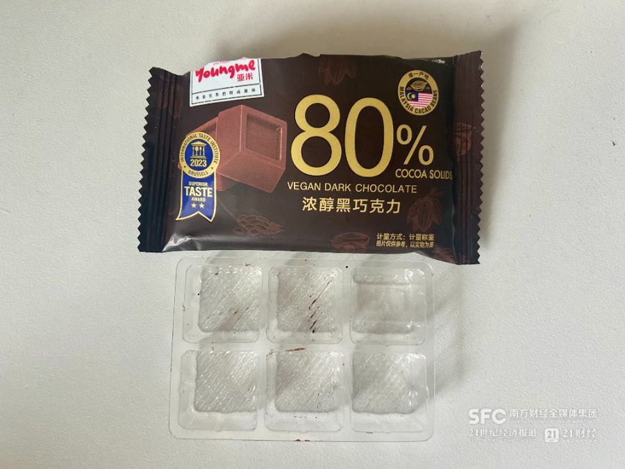 亚米80%可可浓醇黑巧克力的外包装和内包装。摄/本报记者陈归辞