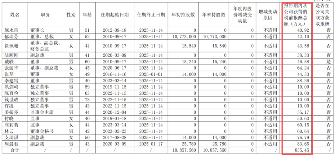 来伊份2024年报披露,报告期末全体董事、监事和高级管理人员实际获得的报酬合计835.45万元,其中董事长施永雷领薪40.92万元,总裁郁瑞芬领薪42.10万元,董事李建钢领薪88.36万元,副总裁周晨君领薪83.65万元,董秘林云领薪60.64万元。