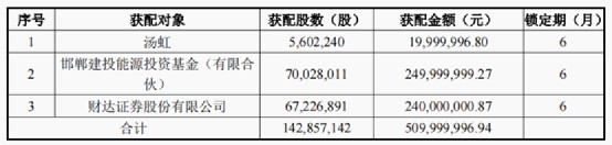 该次非公开发行股票的投资者最终认购142,857,142股,所缴付的认购资金总计5.10亿元,其中汤虹缴付0.20亿元,邯郸建投能源基金缴付2.50亿元,财达冀资1号单一资产管理计划缴付2.40亿元。他们都进入了乾景园林前十大股东行列,股票锁定期均为6个月。