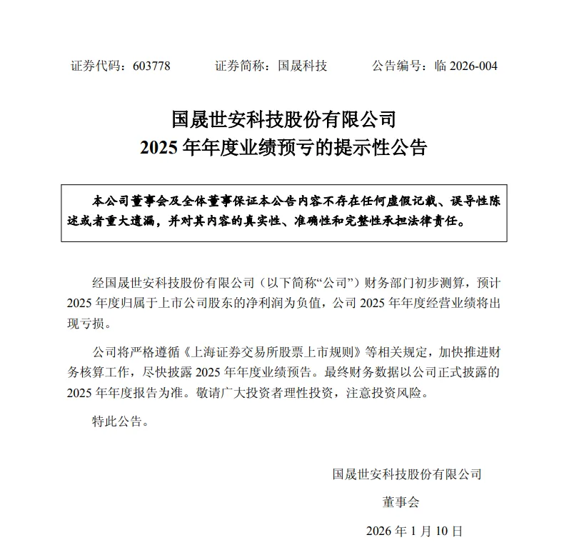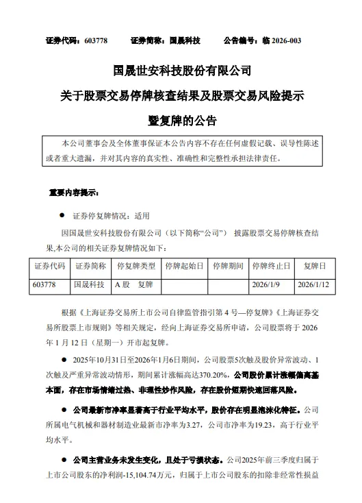 1月9日,国晟科技(603778)发布了两则公告,一是2025年年度业绩预亏的提示性公告,二是关于股票交易停牌核查结果及股票交易风险提示暨复牌的公告。