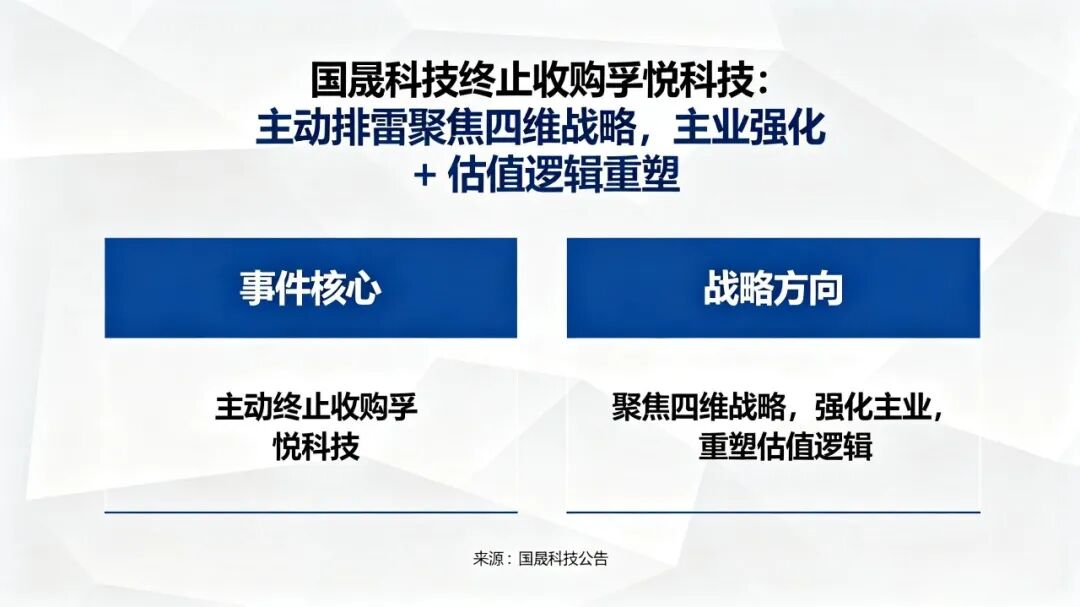 国晟科技终止收购是去风险、归主业、强战略的关键动作,叠加四维战略提速与全场景布局落地,短期压制题材情绪,中长期显著强化龙头定位与估值支撑。