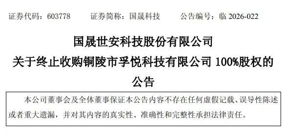 消息上,国晟科技13日发布公告称,终止收购铜陵市孚悦科技有限公司100%股权。