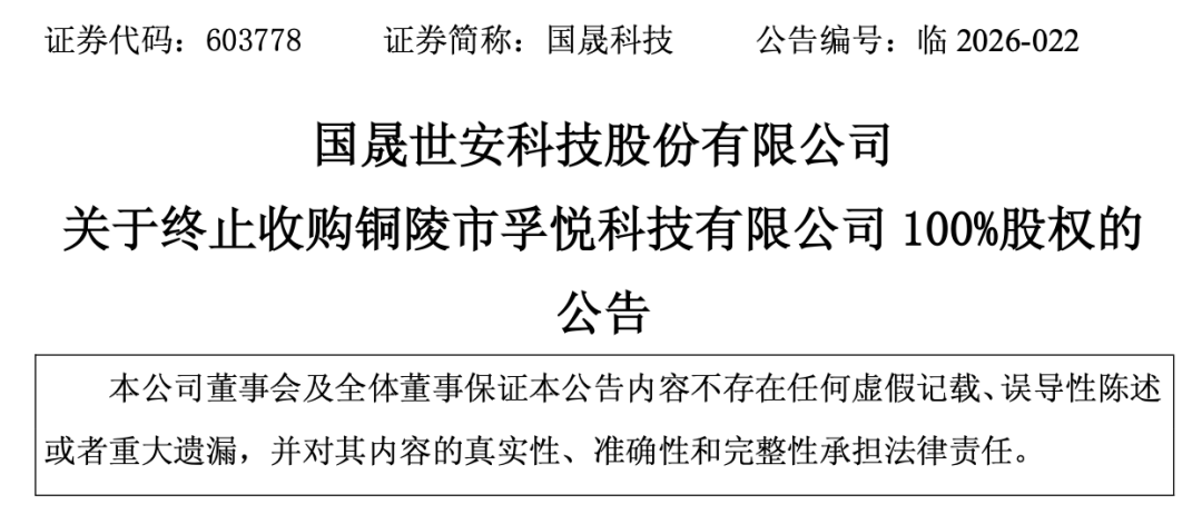 4月14日,国晟科技发布关于终止收购铜陵市孚悦科技有限公司100%股权的公告。