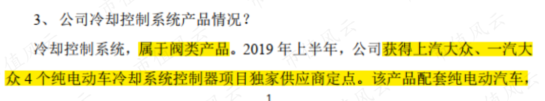 根据2020年投资者调研时回复,冷却控制系统2019年上半年获得4个纯电动汽车冷却系统控制器项目独家供应商定点。即可以用于新能源汽车,但大概率现在还未量产。