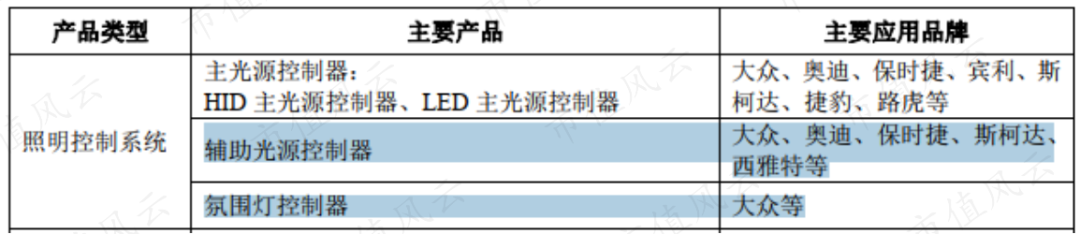 2020年,照明控制系统主要产品包括HID主光源控制器(即汽车电子镇流器)、LED主光源控制器、LED辅助光源控制器和LED氛围灯控制器。