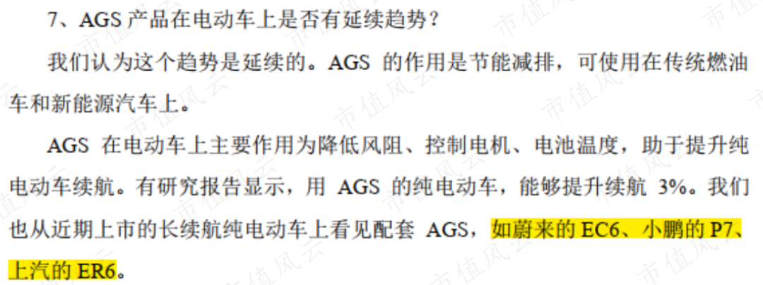 AGS的作用是节能减排,可使用在传统燃油车和新能源汽车上;有研究报告显示,用AGS的纯电动车,能够提升续航3%。