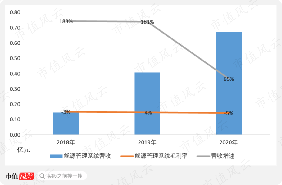 但能源管理系统业务不仅营收规模最小,2020年0.67亿元,营收贡献仅2.34%,而且毛利率连续3年为负数,营收增速快是唯一值得宽慰的事情。