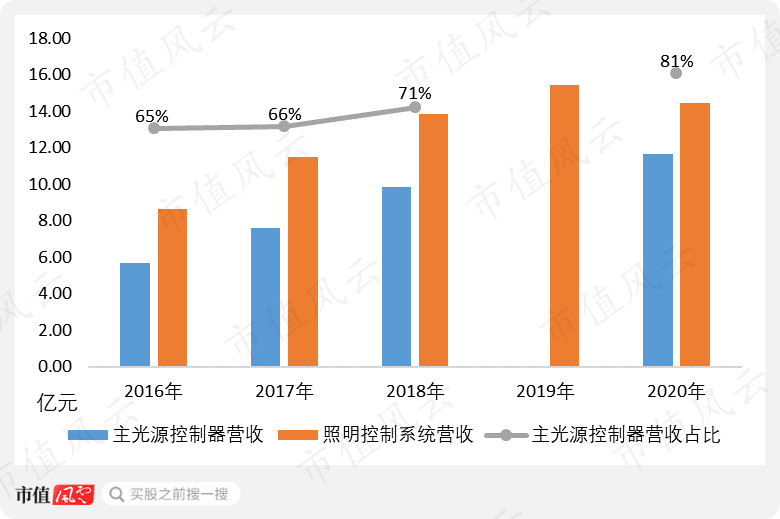 由于主要收入来源主光源控制器近三年几乎不增长,照明控制系统营业收入也几乎未增长。