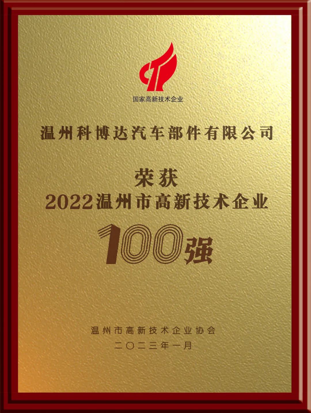 1月3日下午,2023年温州万企创新蜂巢大会顺利举行。现场发布了2022温州市高新技术企业100强榜单,涵盖了智能装备、新能源、新材料、激光等高新技术产业领域,温州科博达公司凭借对科技创新的不懈追求及优异实力上榜。