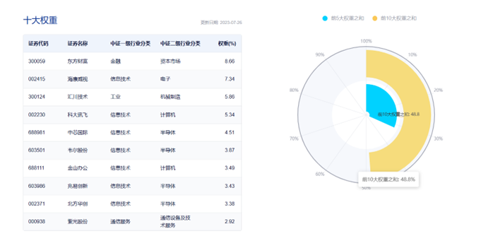 数据显示,截至2023年7月26日,该指数前十大权重股包括东方财富、海康威视、汇川技术、科大讯飞、中芯国际等,前十大之和为48.8%。(数据来源:中证指数公司,指数成份股不代表个股推荐)