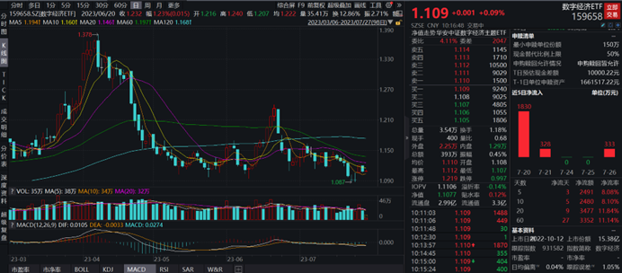 截至10:16,数字经济ETF(159658)高开盘中震荡,现微涨0.09%,成交额持续扩大,市场交投活跃,昨日获资金净流入。