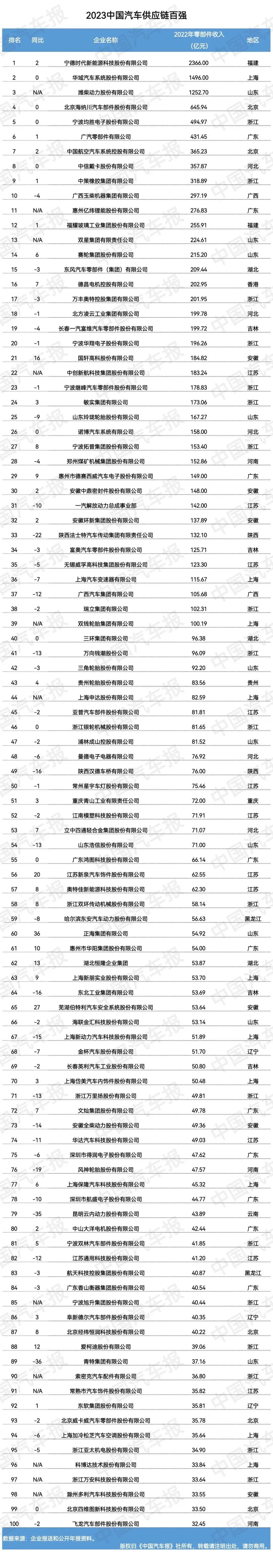 2023中国汽车供应链百强企业中,零部件业务收入过千亿元的有3家,分别是宁德时代(2366亿元)、华域汽车(1496亿元)、潍柴动力(1252.7亿元);零部件业务收入突破百亿元的共有39家,科博达技术股份有限公司今年首次上榜,以33.84亿元零部件业务营收排名第96位。