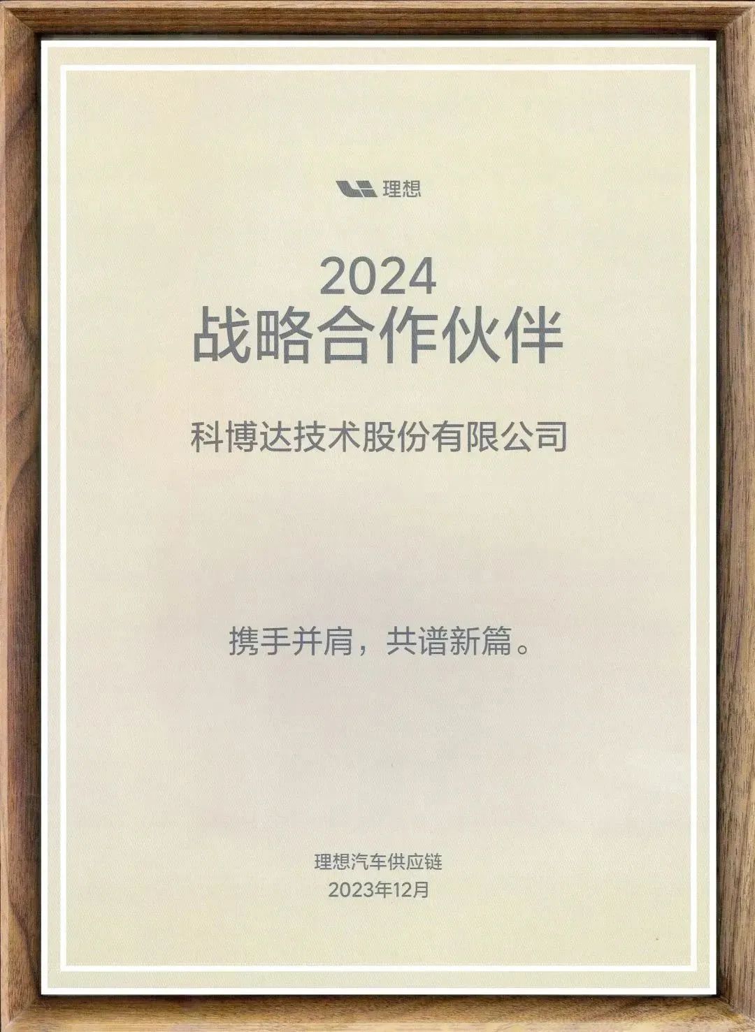 会上,孟庆鹏副总裁宣布科博达成为理想汽车2024年“战略合作伙伴”,孟总指出在理想绩效评估中,从TQCD四个维度中科博达是理想汽车几百家供应商中为数不多四项均获“A”的供应商。