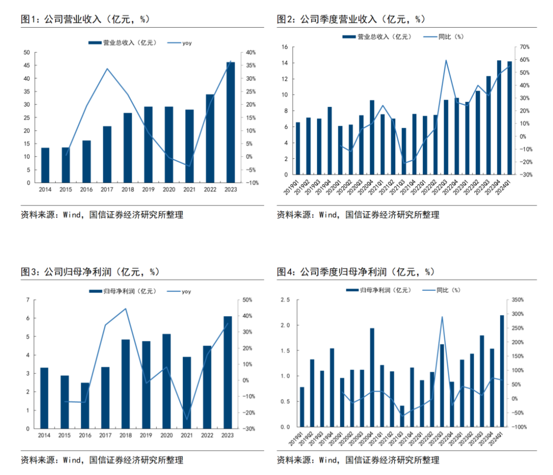 公司2024Q1实现营收14.17亿元,同比增长55.2%,环比下降1%,归母净利润2.19亿元,同比增长66.2%,环比增长42.5%,扣非归母净利润2亿元,同比增长62.4%,环比增长41.8%。