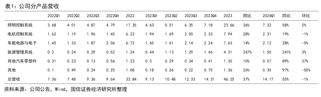 分产品看,公司2023年照明控制系统收入23.66亿元(占比51%),同比增长36%,电机控制系统收入7.94亿元(占比17%),同比增长28%,车载电器与电子收入7.63亿元(占比17%),同比增长14%,能源管理系统(占比9%),同比增长247%。