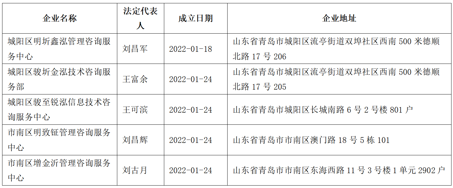 此外,从经营者背景上看,城阳区骏圻金泓技术咨询服务部的经营者王富余疑似为青岛衡滙君欢投资企业(有限合伙)的执行事务合伙人,而该企业的最大合伙人就是康普顿旗下的全资子公司青岛康普顿投资有限公司;同时,王富余所经营这家个体户地址与刘昌军经营的城阳区明圻鑫泓管理咨询服务中心仅一室之隔;而其余几位个体户经营者刘昌辉、王可滨、刘古月之间也能查到疑似合作开办公司的记录。可见,五家个体户背后的经营者与康普顿公司之间很可能存在业务上的关联。