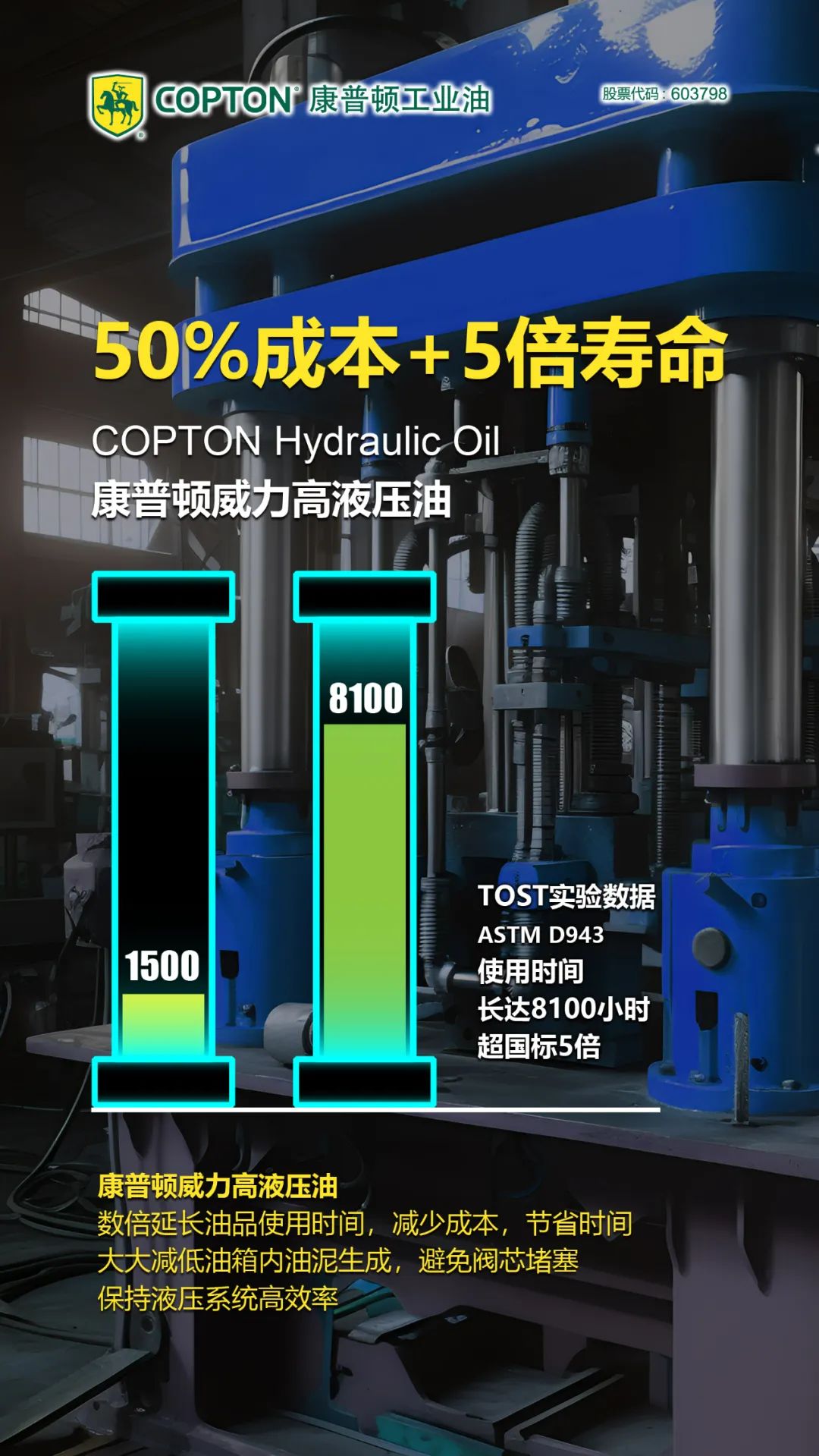 在工业油领域消耗量占比高达46%的液压油产品方面,抗氧化性能是产品使用寿命的关键指标。优异的抗氧化性能可以有效地减少液压油在使用过程中的油泥生成量,避免液压系统的阀芯堵塞,保持液压系统的清洁度和高效率。在国标中对普通液压油的抗氧化性能tost(ASTM D943)不低于1000小时,高压液压油的抗氧化性能tost(ASTM D943)不低于1500小时,“康普顿长寿命工业油品研究所”通过技术攻关和配方创新,新推出的康普顿威力高液压油tost(ASTM D943)可达到8100小时,是国标高压液压油抗氧化寿命的5倍,普通液压油寿命的8倍。使用康普顿威力高液压油,可以成倍的延长油品使用时间,减少频繁换油的物料成本和时间成本,并大大减少油箱内的油泥生成,规避阀芯堵塞,保证液压系统压力传递的高效率。