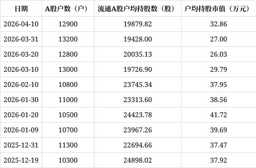4月13日消息,数据显示,截至2026年4月10日,康普顿A股股东总户数为1.29万户,较上期(2026年3月31日)减少300户,降幅2.27%。公司最新A股总股本为2.56亿股,其中流通A股2.56亿股,户均持有流通A股数量为1.99万股,较上期增加451.81股,增幅2.33%;户均持流通A股市值32.86万元,较上期增加5.86万元,增幅21.69%。