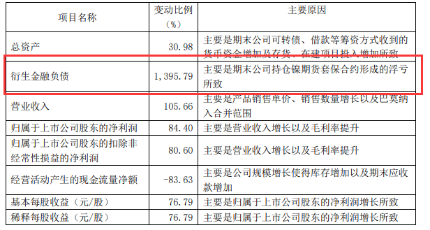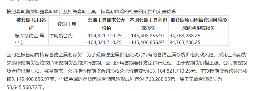 截至2021年年末,华友钴业持仓镍期货合约形成公允价值变动损失1.05亿元,本期镍期货合约共形成损失1.45亿元,含镍金属的存货因被套期风险形成利得9476.33万元,属于无效套期损失为5064.56万元。
