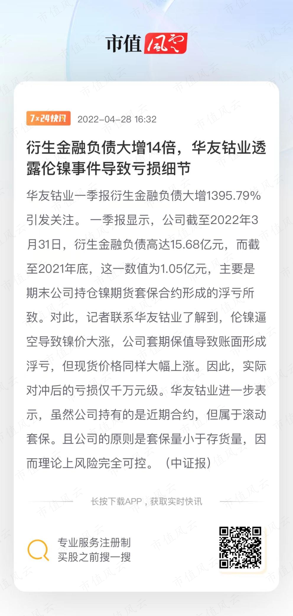 这次,华友钴业也迅速回应,称公司套保浮亏是由于伦镍逼空造成的镍价大涨所致,不过公司现货价格同样大幅上涨。因此实际亏损仅千万级别,风险可控。