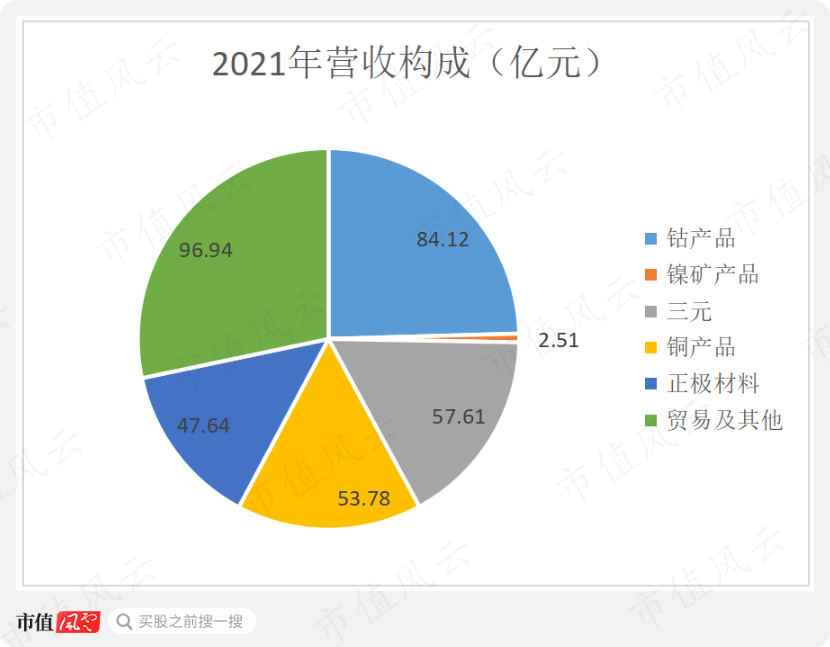 除贸易营收外,2021年公司营收占比较高的为钴产品、铜产品、三元前驱体产品和正极材料,镍产品主要自用于三元产品,外销较少。