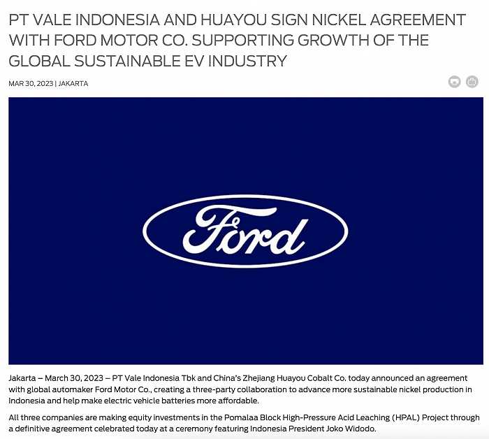 当地时间3月30日,福特汽车宣布与淡水河谷印尼公司及华友钴业达成最终协议,三家公司都将对波马拉(Pomalaa)矿区高压酸浸(HPAL)项目进行股权投资。项目投资总额(包括高压酸浸冶炼厂和矿山)预计将达67.5万亿印尼盾(约合45亿美元)。该项目将采用华友钴业的高压酸浸技术,每年将生产至多12万吨镍产品。