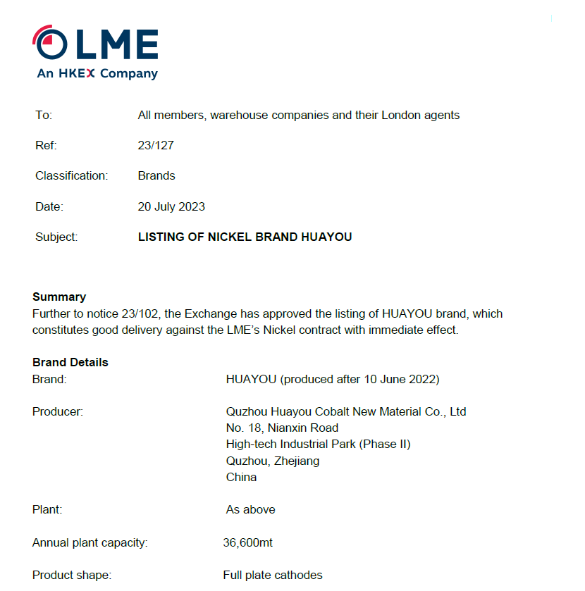 2023年7月20日,‘HUAYOU'牌电解镍成功注册伦敦金属交易所交割品牌,注册产能36600吨,成为LME镍品牌注册快速通道推出后的第一家受益的公司。即日起,此品牌可以在LME仓库交割。