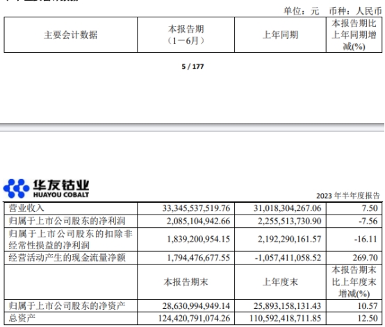 华友钴业于2023年8月25日晚间披露2023年半年度报告。今年上半年,公司实现营业收入333.46亿元,同比增长7.50%;归属于上市公司股东的净利润20.85亿元,同比下降7.56%;归属于上市公司股东的扣除非经常性损益的净利润18.39亿元,同比下降16.11%;经营活动产生的现金流量净额17.94亿元,上年同期为-10.57亿元。