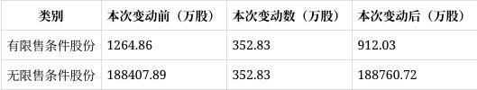 此次解禁前,公司流通股数量为18.84亿股;此次解禁后,公司流通股数量为18.88亿股。此次实际可流通股份数量为352.83万,占解禁后流通股份数量之比为0.1869%。
